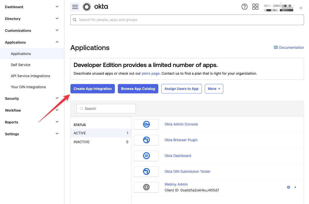 To create an OIDC app integration, navigate to Applications -> Applications, and click the Create App Integration button: