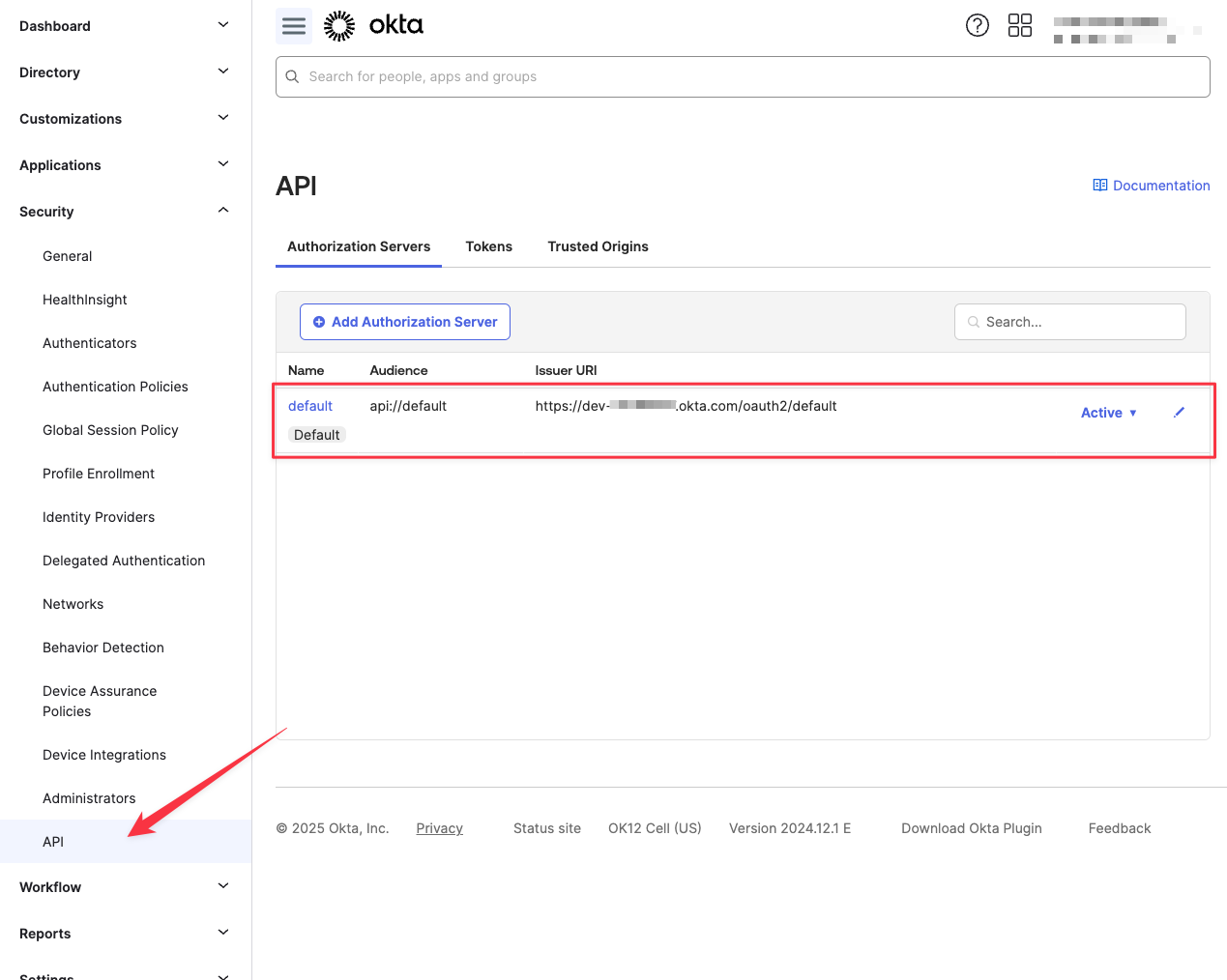 In the Okta dashboard, Navigate to Security -> API, and access your desired authorization server.