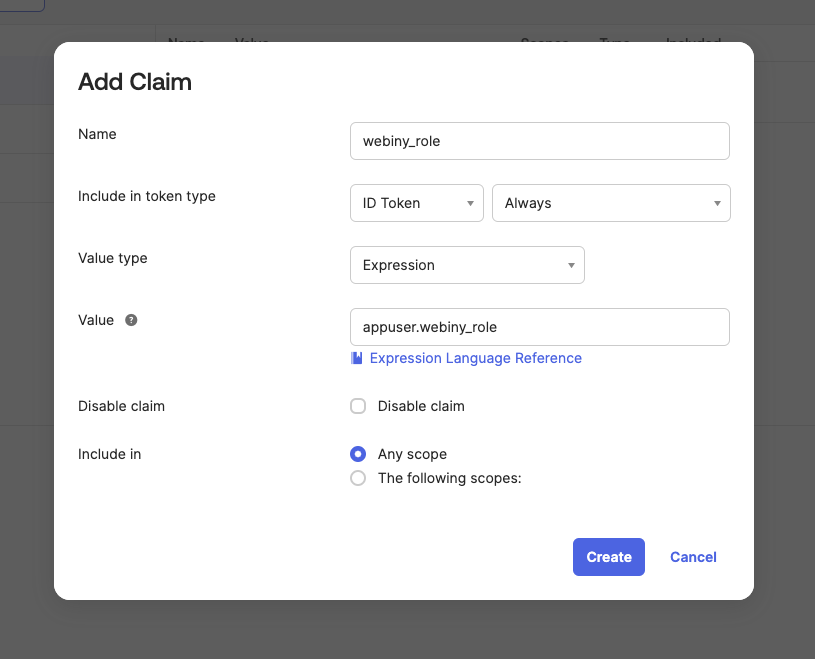 Make sure your claim is included in ID Token. The appuser.webiny_role expression means that the value for the claim will come from the current user, using the webiny_role attribute value, which the user inherits from the Okta group he is assigned to.
