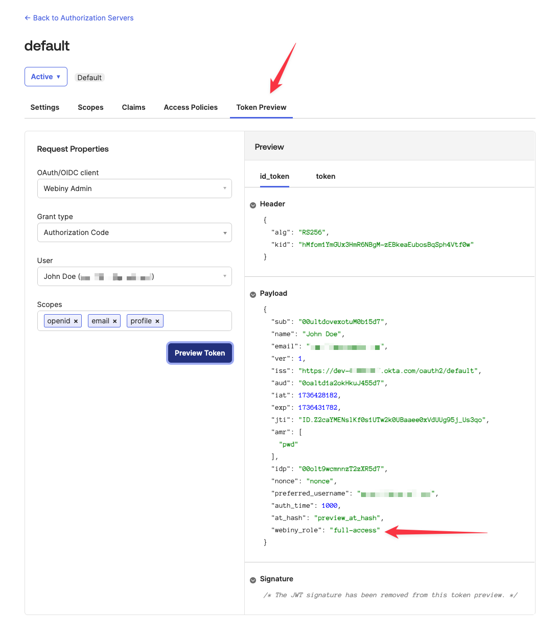 If everything is configured correctly, your idToken will contain a webiny_role claim, and its value will correspond to the Webiny Role custom attribute, which was assigned to the Okta group earlier.