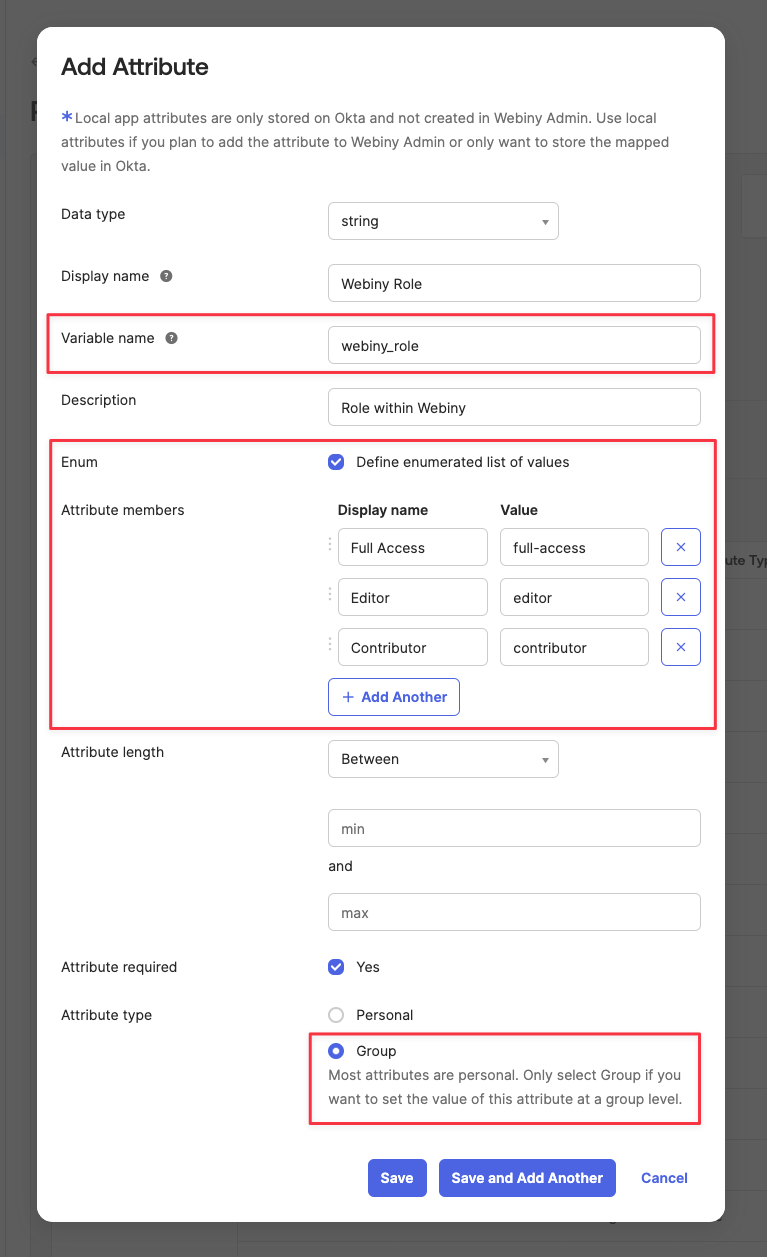 The important configuration parameters are highlighted in red. Variable name will be used to map this attribute value to the idToken claim. For Attribute members, it’s recommended to use enumerated list of values, to reduce the possibility of invalid mappings. Lastly, the Attribute type must be set to Group, to have this attribute be mapped when assigning Okta groups to the OIDC app.