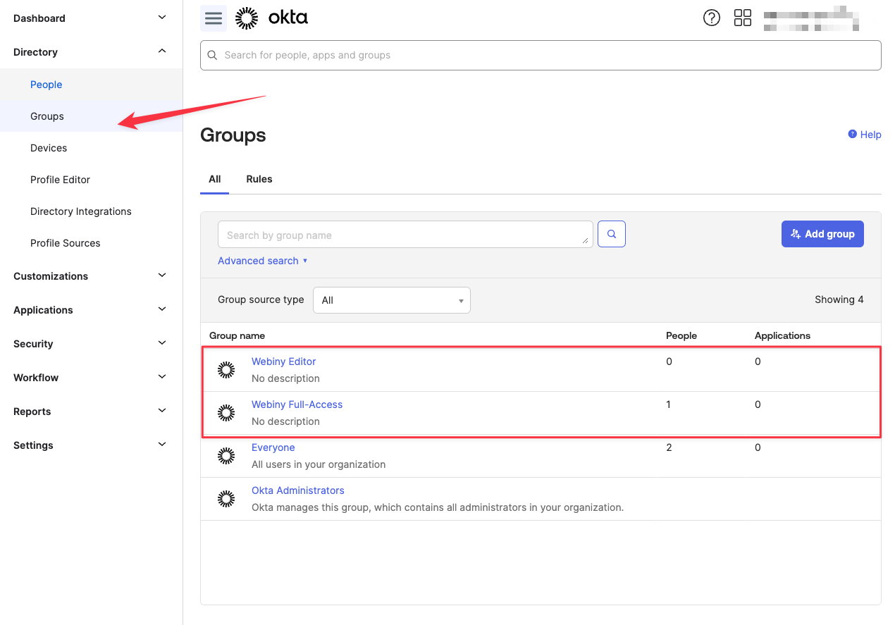 Now you need to assign your Okta groups to the OIDC app. Navigate to Directory -> Groups. Here you’ll find a list of all Okta groups. If you haven’t already, create the desired user groups. Each user group will map to one of the Webiny roles in Webiny.